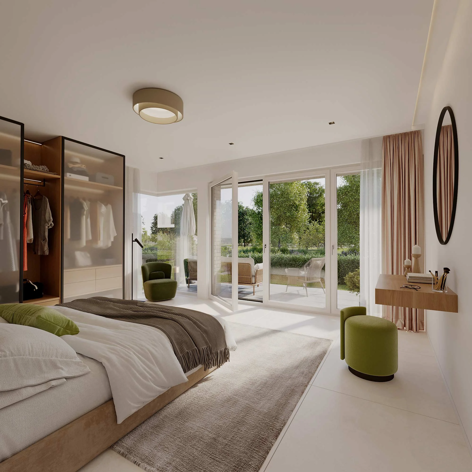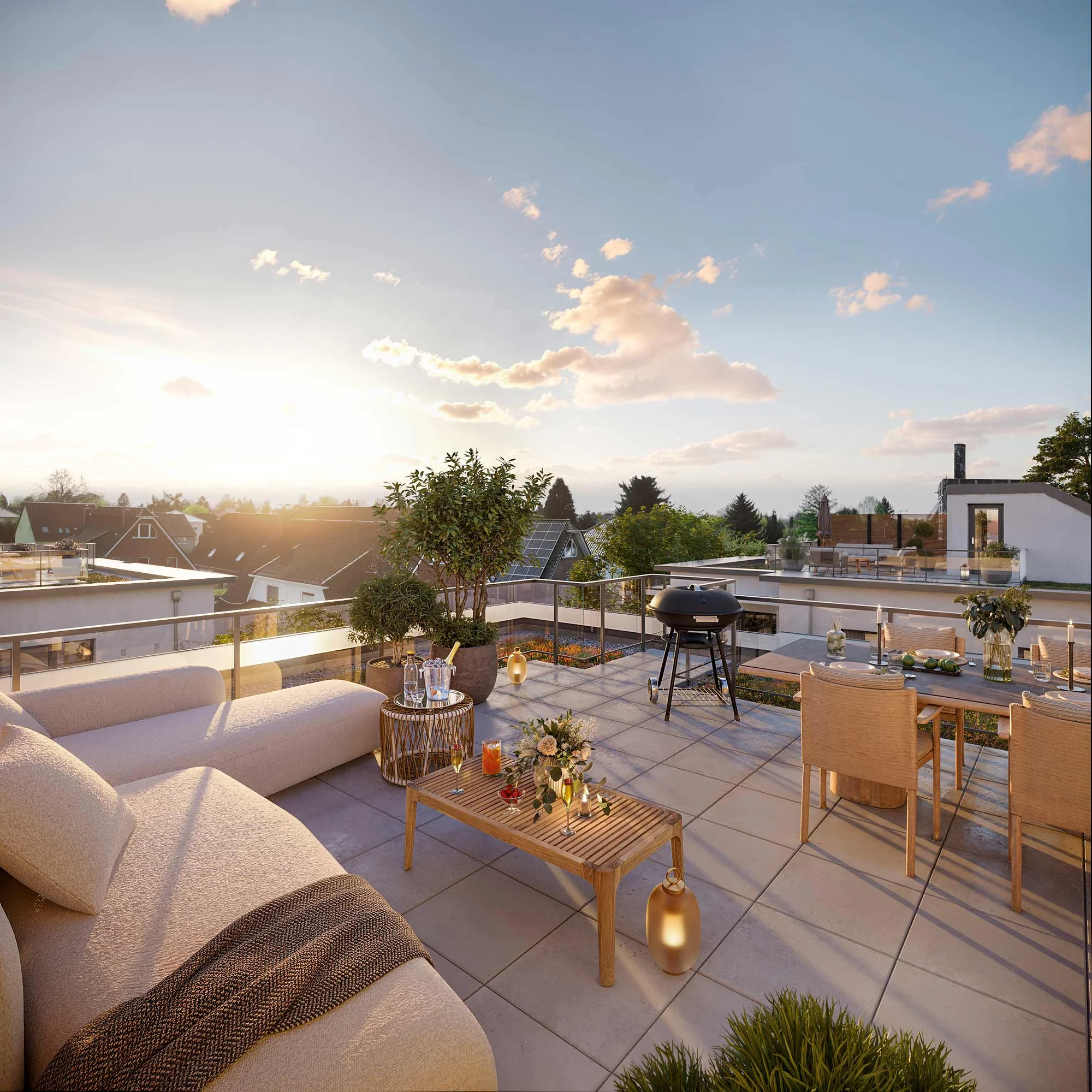Jede Wohnung verfügt über einen privaten Außenbereich – wahlweise Balkon, Dachterrasse oder Terrasse mit direktem Gartenzugang. Dank der Tiefgarage mit direktem Zugang per Aufzug ist ein barrierearmer und komfortabler Wohnalltag gewährleistet. Fahrradabstellflächen, Stellplätze für Elektrofahrzeuge und großzügige Raumangebote im Kellergeschoss ergänzen das sorgfältig konzipierte Wohnkonzept.